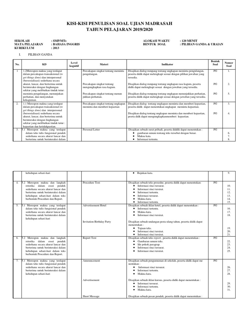 Kisi Kisi Soal Bahasa Inggris Ujian Madrasah Ujian Sekolah Kelas 9 Mts Smp from 1.bp.blogspot.com Ujian madrasah mapel bahasa inggris untuk mts ini kami bagikan secara gratis dan dapat diunduh dengan mudah melalui penyimpanan google drive untuk memudahkan para guru dalam mendapatkan contoh soal atau sebagai bahan latihan siswa dalam menghadapi pelaksanaan ujian madrasah jenjang mts. Dengan adanya latihan soal ujian bahasa inggris mts ini, pelajar akan sangat terbantu untuk menghadapi ujian madrasah tahun pelajaran 2021 ini khususnya peserta didik kelas 9 mts. Latihan soal ujian akhir madrasah mi tahun 2021 tahun pelajaran 2021/2022. Kegiatan belajar mengajar sudah berjalan. Latihan soal ujian madrasah um bahasa inggris tahun 2021 ini untuk membantu belajar peserta didik kelas 12 madrasah aliyah (ma) dalam menghadapi ujian madrasah tahun pelajaran 2020/2021. Kompetensi bahan kls/smt materi indikator soal no. Soal ujian sekolah us bahasa inggris smp mts kurikulum 2013 ini untuk membantu belajar peserta didik kelas 9 smp/mts dalam menghadapi ujian sekolah tahun pelajaran 2020/2021. Download soal un unbk bahasa inggris smp mts 2020.